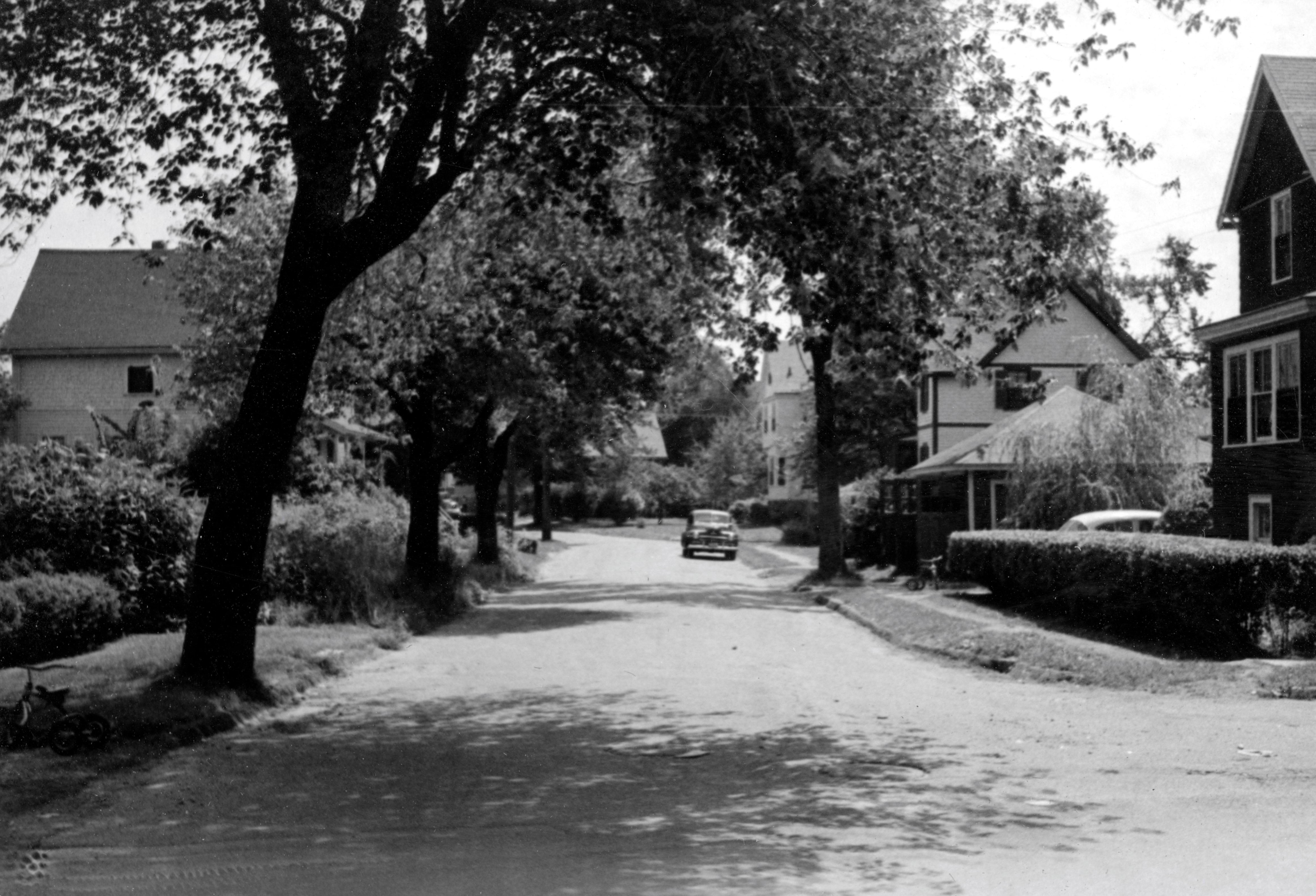 Looking up Sanford Street. Our house on left; Cutter Street on right.
