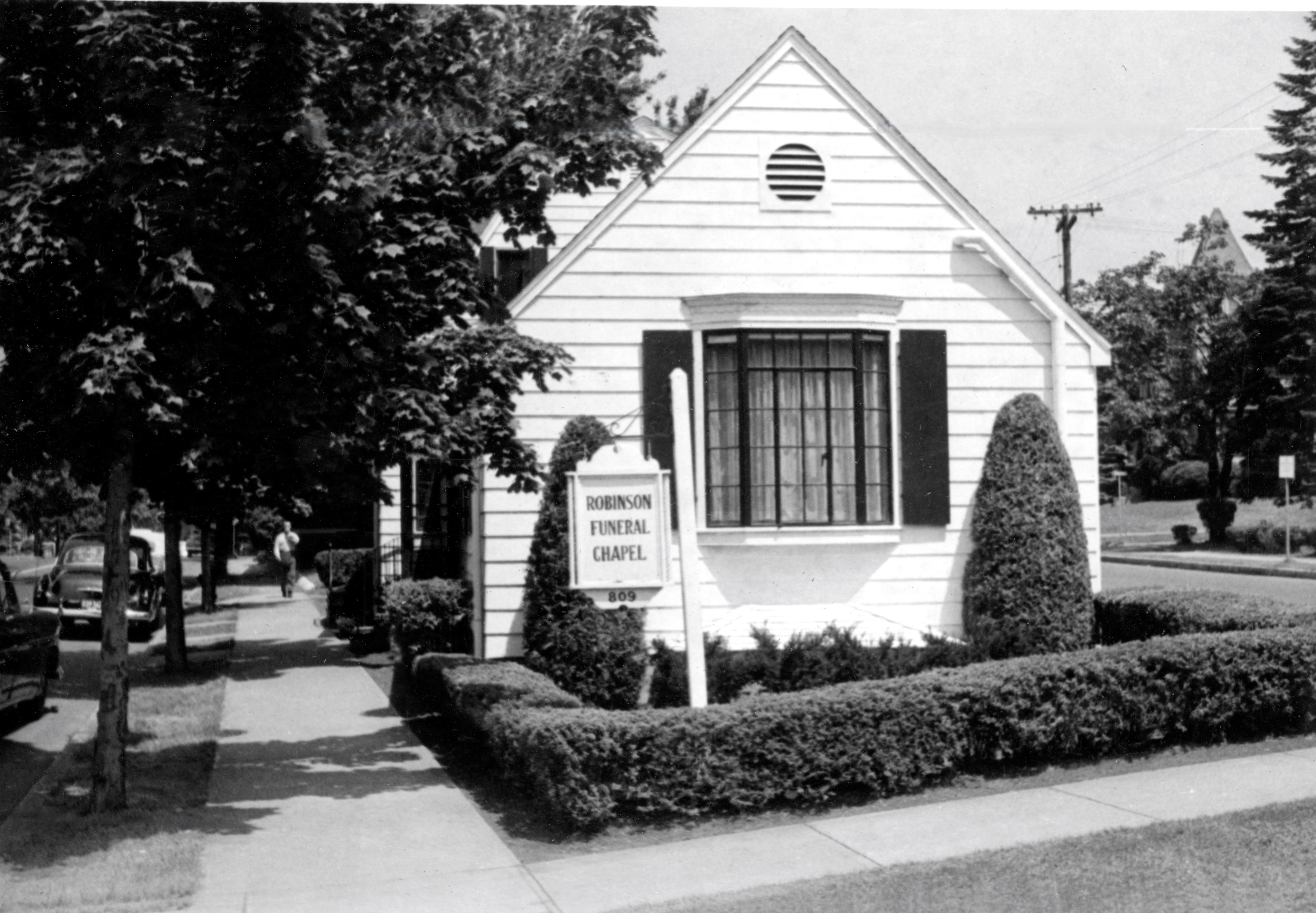 Robinson Funeral Home at intersection of Main and Green Streets.