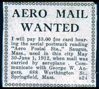Add for 1912 Aero mail, Harry Atwood flew the mail