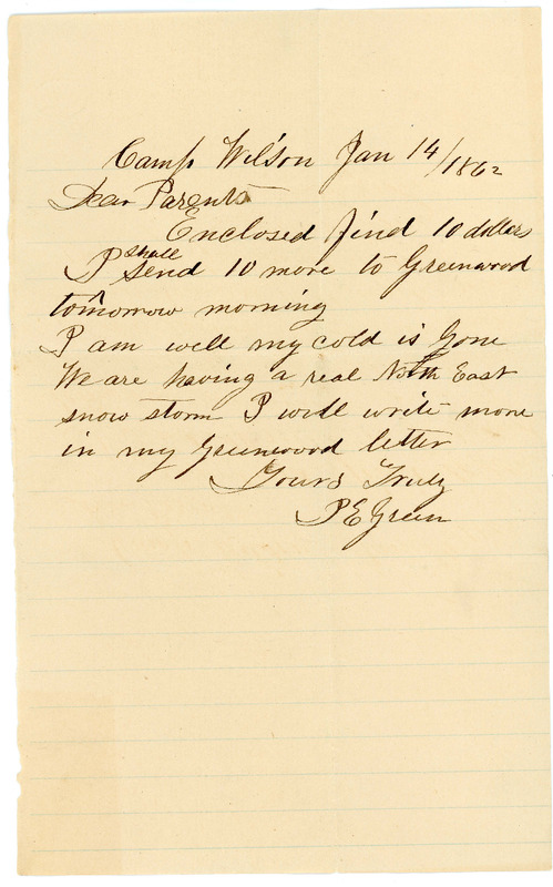 - A letter from Isaac Edward Green to his parents and sister, Lucinda.
