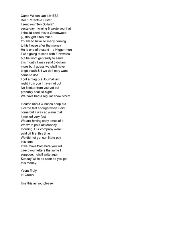 - I.E. Green Letter January 15,1862
