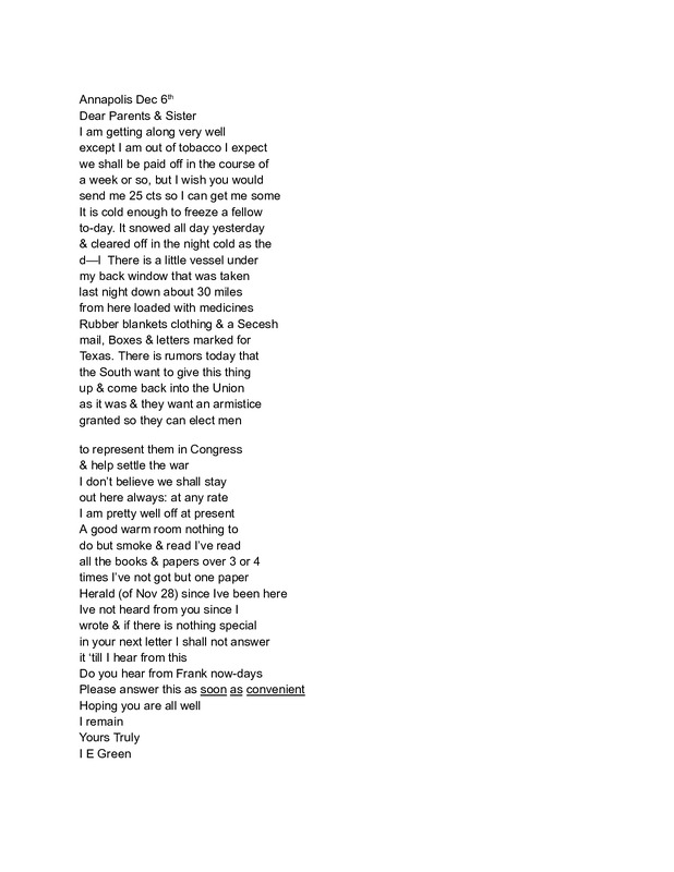 - I.E. Green Letter December 6, 1862
