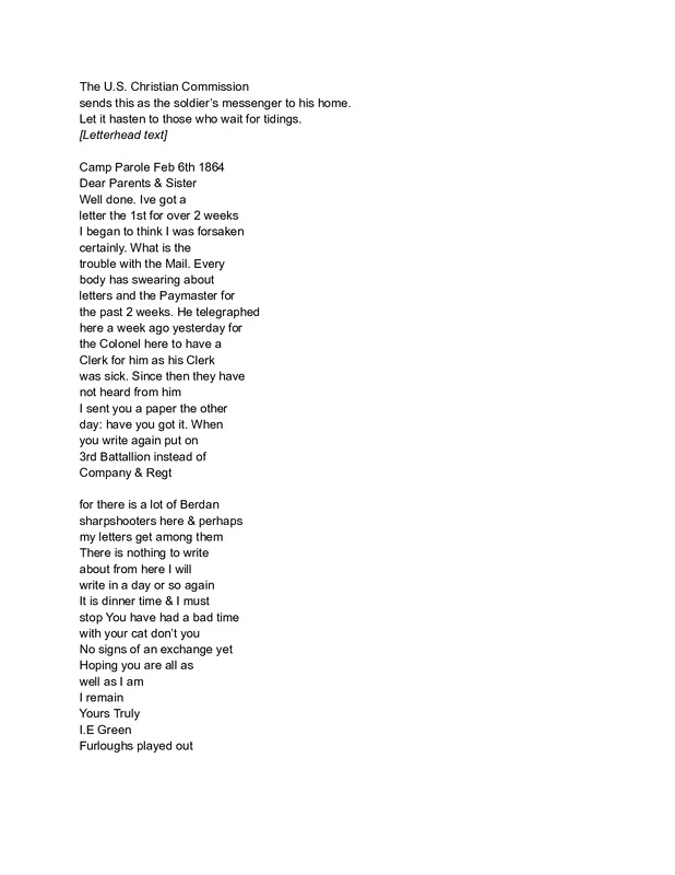 - I.E. Green Letter February 6, 1864